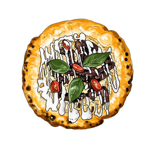 Yellow datterino pomodoro, mozza fior di latte, scamorza fumée, crispy Parma, burrata crémeuse, pesto fresco.