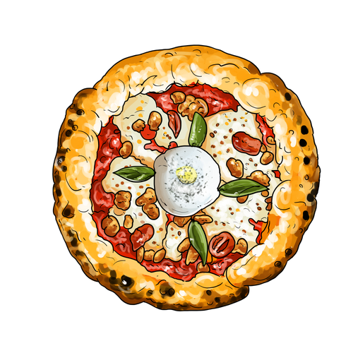 Pomodoro San Marzano, mozza fior di latte, poulet mariné, burrata crémeuse, tomates confites, poivre noir, basilic.